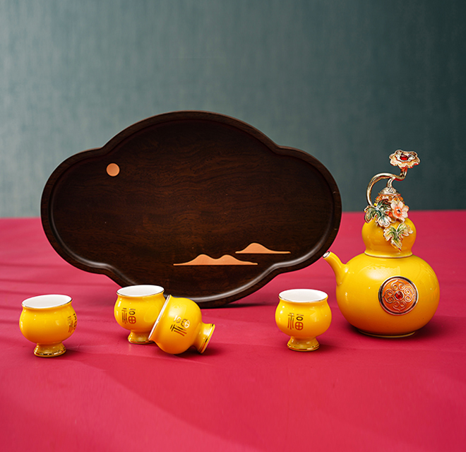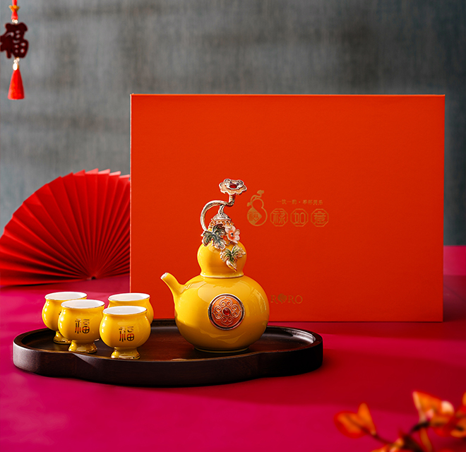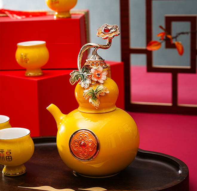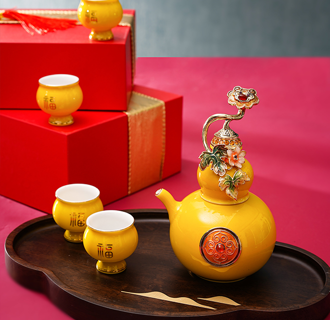 葫蘆的上半段是個倒扣的茶杯,杯底加上如意,如意頭部上面鑲半寶。尾端演化為葫蘆葉和花,琺瑯彩上色令其更顯生機靈動。瓶身和杯身材質源于有著東方色彩的米白瓷釉,質地溫潤光滑,高溫燒制而成。