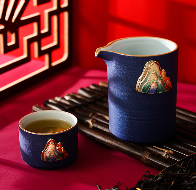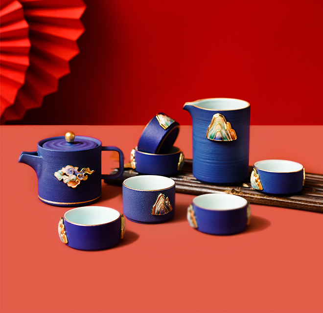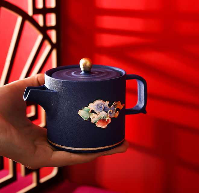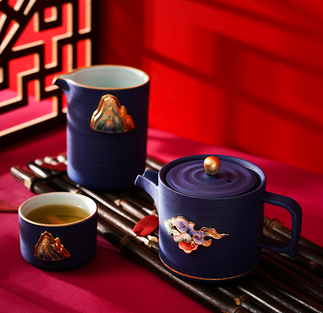 藍色陶瓷茶壺套裝,配色典雅,富有禪意,視覺上具有國潮美學魅力。壺底及壺頂蓋耳為金色,寓意富貴榮華、家業興旺。茶壺中央鑲飾一片彩色祥云,杯身鑲飾高山,饒有意境之美,琺瑯彩工藝令祥云和高山的色彩動人心魄。壺身造型獨具匠心,線條流暢,每一處細節均以匠心打造而成。