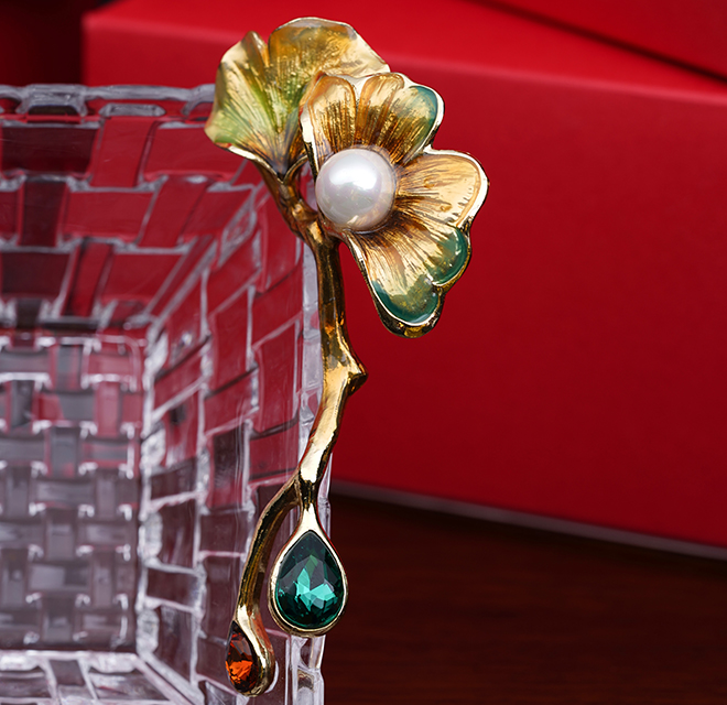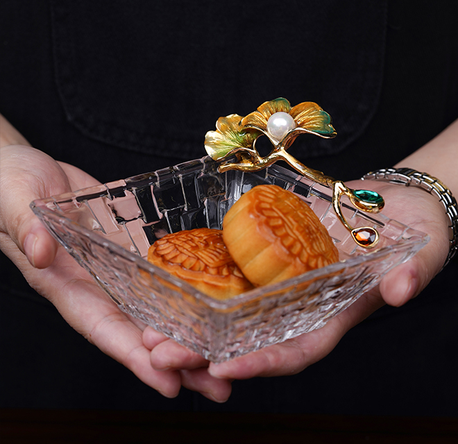 當琺瑯彩的工藝邂逅銀杏葉,令作品洋溢著色彩的奢華與優雅感,是自然元素與匠心工藝的現代表達。一顆碩大璀璨的橙色水鉆鑲嵌于銀杏葉中央,高貴而靈動。“幸福有禮”中秋禮盒顏值與內涵兼具,集藝術性、裝飾性與功能性為一體,是中秋送禮或珍藏自用的心動禮盒。