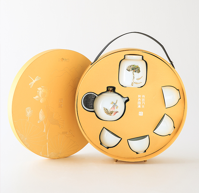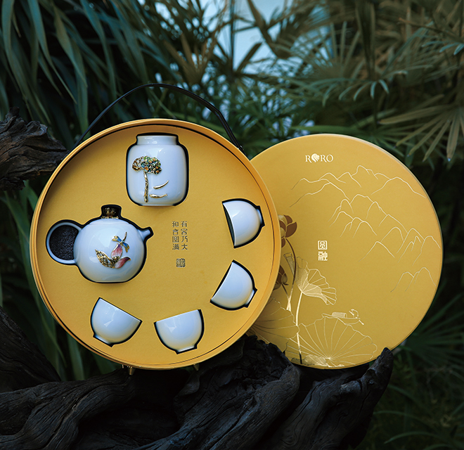 設計師將大自然中發現的美化作茶具創意,靈感源自圓和荷塘美景。和合圓滿,有容乃大。寓意幸福圓滿、笑口常開、吉祥如意。