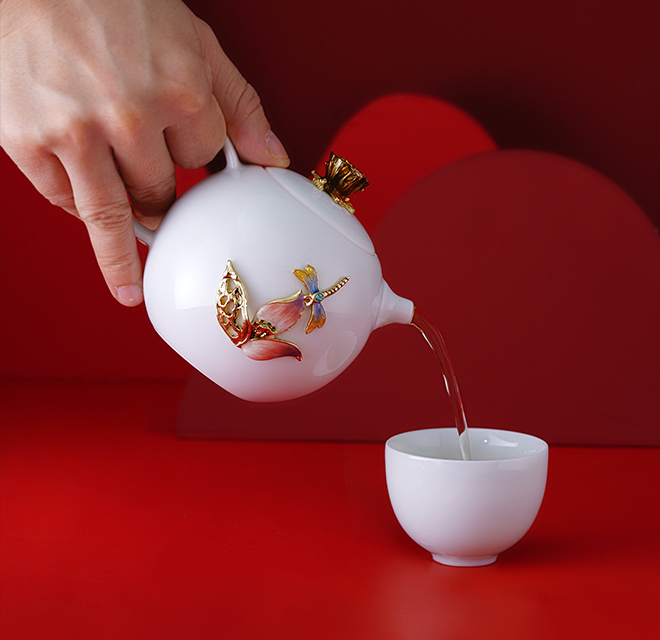 青瓷釉如涓涓溪流,經多道工序燒制而成,溫潤如玉,氣質典雅。荷花、蓮蓬、蜻蜓勾勒美好景觀,給人如詩如畫般的愜意品茶享受,不失為桌子上的藝術品。茶具造型均以圓潤曼妙的曲線,締造舒適柔和的品茶體驗,品茶悟道,盡享圓融美好人生。