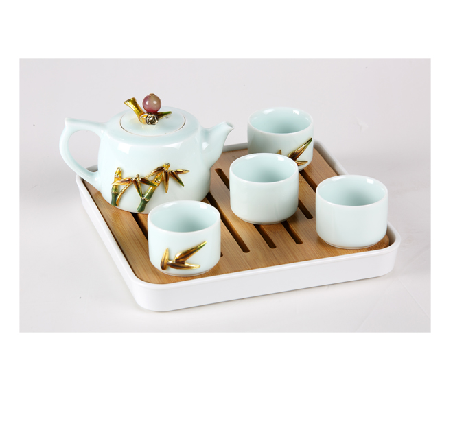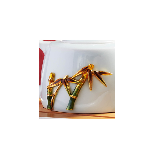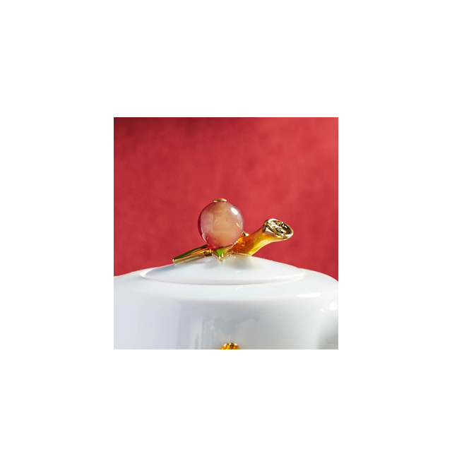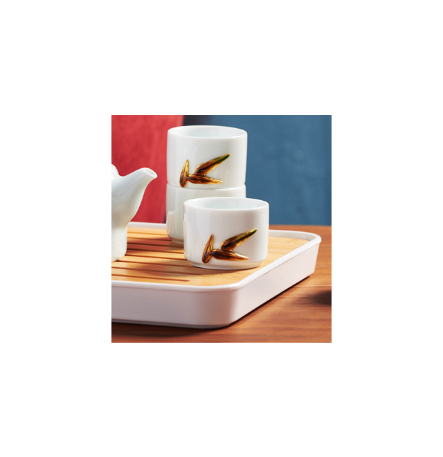 “咬定青山不放松,立根原在破巖中, 千磨萬擊還堅(jiān)韌,任爾東西南北風(fēng)。”以此詩為靈感,以竹韻套裝描述生命的堅(jiān)強(qiáng)韌性,不管遭遇何種困難,依然挺拔不屈、奮發(fā)圖強(qiáng)。作品將大自然的竹林意境巧妙融入立體造型中,一段竹節(jié)化作壺蓋,竹節(jié)上鑲嵌寶石,熠熠生輝,金屬竹節(jié)竹葉攀附于溫潤陶瓷壺身,讓品飲更添雅趣。