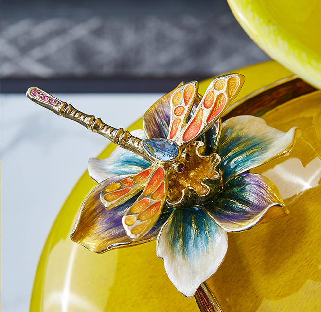 采用黃色高溫亮釉陶瓷作為瓶身,黃色自古以來是皇帝的專用色,象征著榮華富貴與希望。羅比羅丹研發的琺瑯彩技藝,賦予鳶尾花優雅特質及華美色彩,而彌足珍貴的水鉆鑲嵌其中,高貴華麗、別具特色,蝴蝶翩翩起舞,共同譜寫一曲撼動人心的自然家居藝術作品。