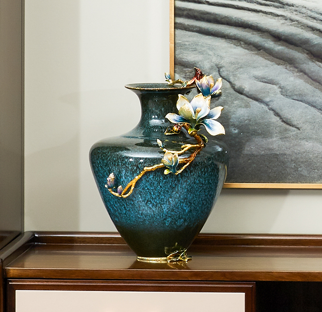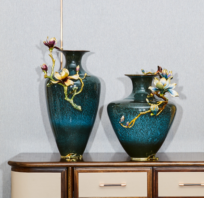 擁有渾厚東方色彩的高溫亮釉陶瓷為瓶身,合金鑄造的玉蘭花枝攀附于瓶身向上蓬勃生長,枝干頂端的玉蘭花正熱烈綻放,末端花朵含苞欲放,花姿清雅、純潔,色澤動人的琺瑯光彩,與合金鑄造的枝干融為一體,加以水鉆點綴其中,閃耀光芒,仿若一幅和諧動人的自然美景。