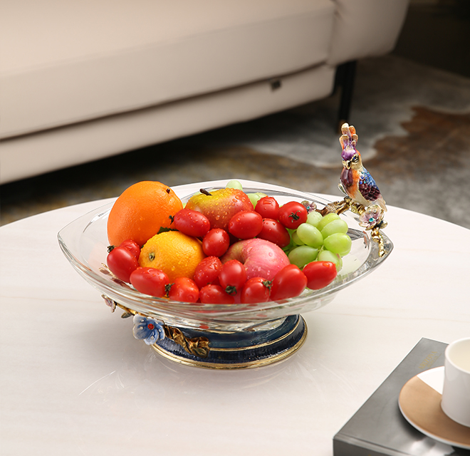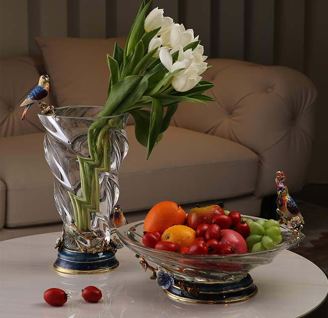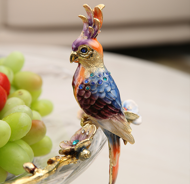斜螺旋紋厚重透明水晶玻璃果盤,紋理時尚大氣。圓形合金底座,雙金邊裝飾,藍色琺瑯彩與金邊交相輝映,呈現復古質感。一根分叉的大樹枝攀附著水晶花瓶向上生長,樹枝長出幾朵精致小花,一只鸚鵡站立于水晶玻璃果盤上,姿態愜意,鸚鵡采用精美琺瑯彩工藝上色,呈現藍紫、橙紅的優雅漸變色,翅膀精鑲璀璨水鉆,令鸚鵡活靈活現,高貴的氣息呼之欲出。