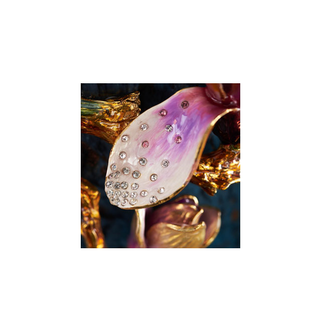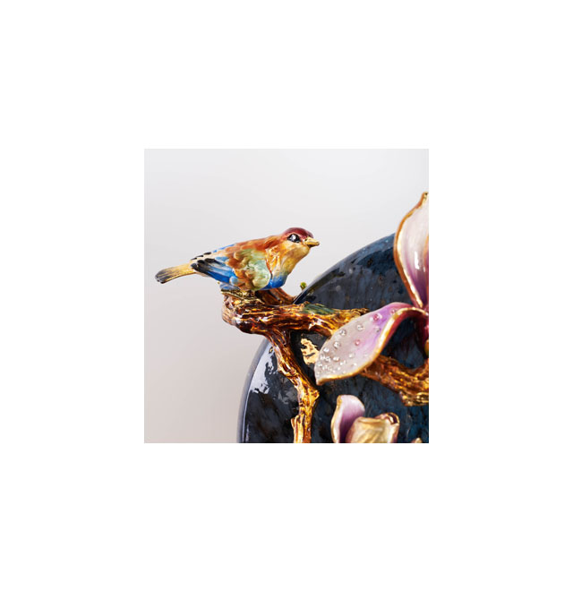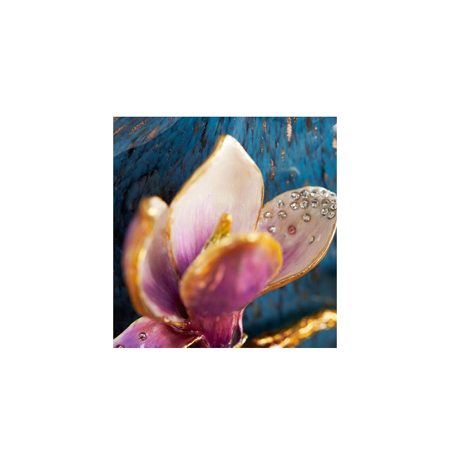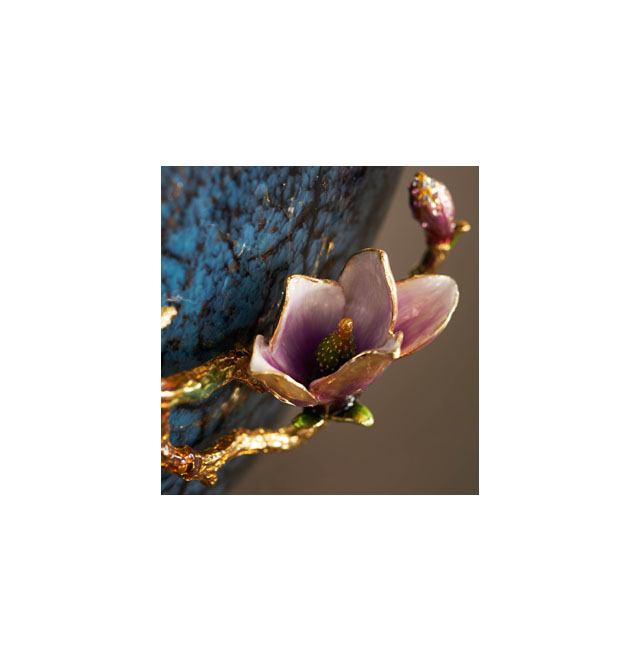 遒勁枝干自然盤旋于瓶身之上,妖嬈動人,迸發出向上的力量。極具藝術美感的琺瑯彩,將玉蘭花開的熱烈姿態展現得淋漓盡致,跨越時空的美在琺瑯彩優雅的光澤下迎風搖曳。手工鑲嵌的水鉆凝聚無限光芒,整件作品仿若一氣呵成,撞擊出美麗的視覺盛宴。玉蘭花是高潔、純粹、真誠的代名詞,是饋贈親友的不二之選。