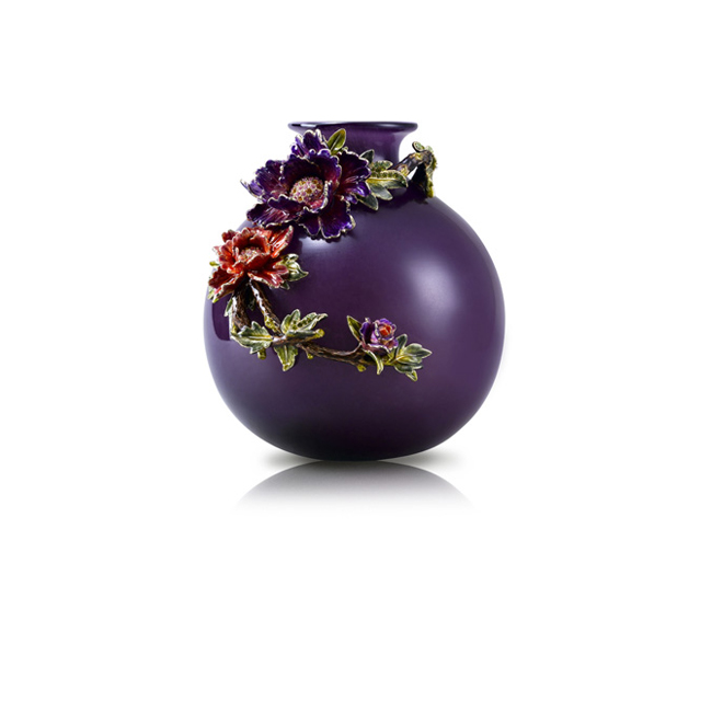 牡丹花瓣的姿態(tài)自然而舒展,花蕊鑲嵌閃耀美鉆,映襯著琺瑯彩華麗大氣而不失高貴,花枝自然伸展攀附于紫色瓶間,縈繞勾勒出喜慶祥和的氛圍。