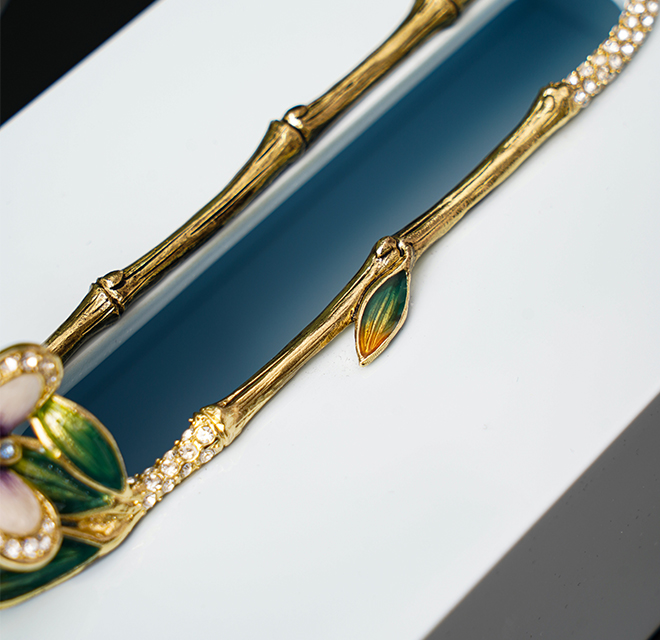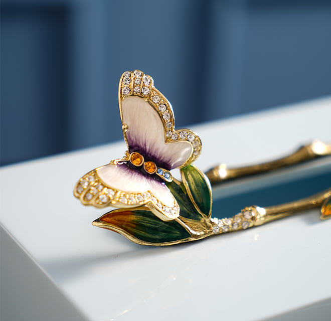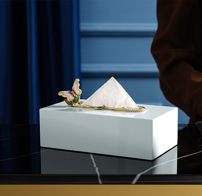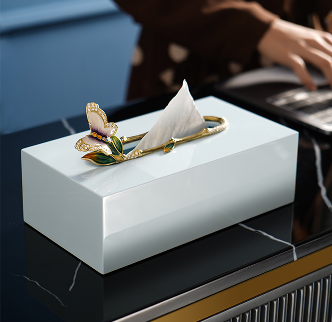 抽紙口處以一圈雅致竹節裝飾,竹節上蓬勃生長出幾片綠色竹葉。尾端竹葉上一只合金鑄造而成的蝴蝶展翅欲飛,蝴蝶翅膀以珍珠膏打底,鑲嵌師巧妙地將水鉆鑲嵌于蝴蝶身上,流光溢彩,與合金交相輝映。竹葉及蝴蝶經琺瑯彩手工技藝雕琢上色,令作品持久綻放華光。紙巾盒底部封口采用磁鐵吸附方式,人性化貼心設計,便于更換紙巾。