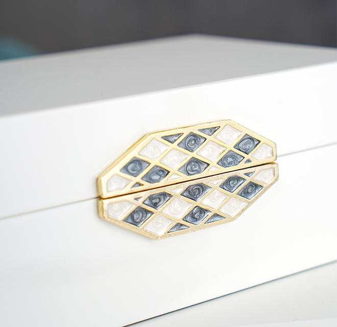 作品甄選月白色鋼琴漆木精制而成,在質量和尺寸上精益求精,設計簡約大氣、現代輕奢。菱形金邊鏤空線條交織而成,紋理經典優雅,部分菱格填以墨綠色琺瑯彩,持久綻放華光。