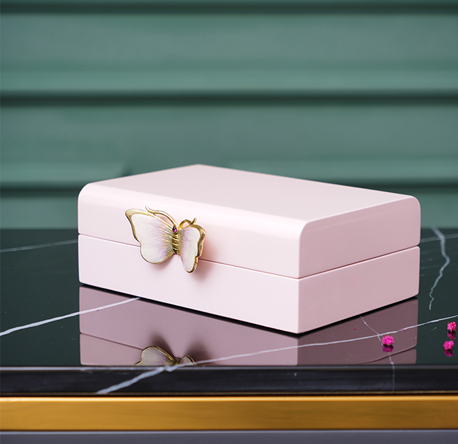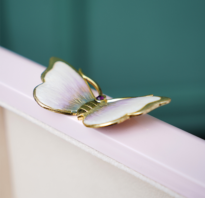 盒子中央處是一只合金鑄造而成的蝴蝶作為裝飾,紫色琺瑯彩呈漸變色,令蝴蝶更具生機活力,鑲嵌師巧妙地將水鉆鑲嵌于蝴蝶身上,流光溢彩,與合金交相輝映。