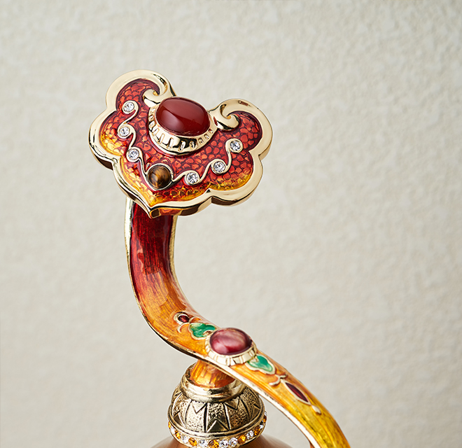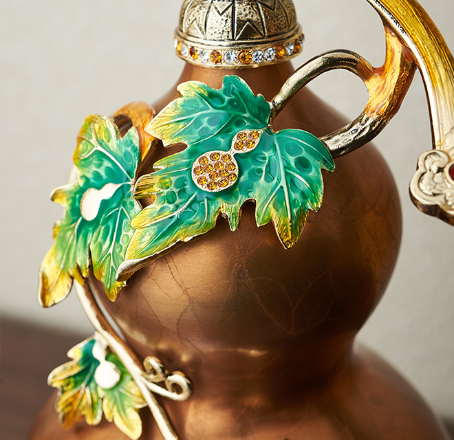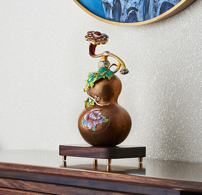 葫蘆以純銅鑄造而成,金屬質(zhì)感強,不同角度觀賞,呈現(xiàn)如鏡面般的光澤變化。葫蘆上方是如意造型,寓意萬事如意,如意頭部中央精鑲?cè)A美大寶石,周邊點綴小鉆,在居所里綻放耀眼光芒。如意桿向下衍生一枝葫蘆藤蔓,藤蔓上生長出形狀各異的葉子,增添蓬勃生機感。大葉子中間留葫蘆狀的光面造型,獨具匠心。葫蘆前后面各陰刻一朵牡丹花,令作品更臻美妙。